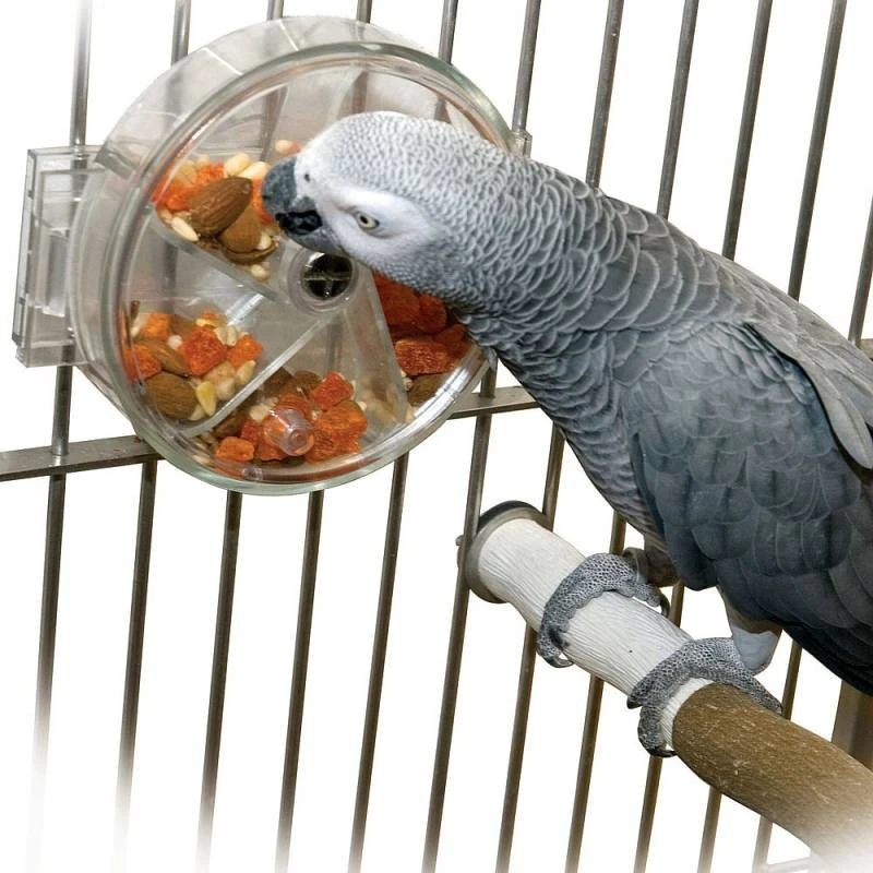 Remplissez la roue de nourriture avec des bonbons ou (une partie de) sa nourriture quotidienne. L’oiseau tourne la roue, puis il y a une ouverture au niveau de la nourriture et il obtient sa récompense.